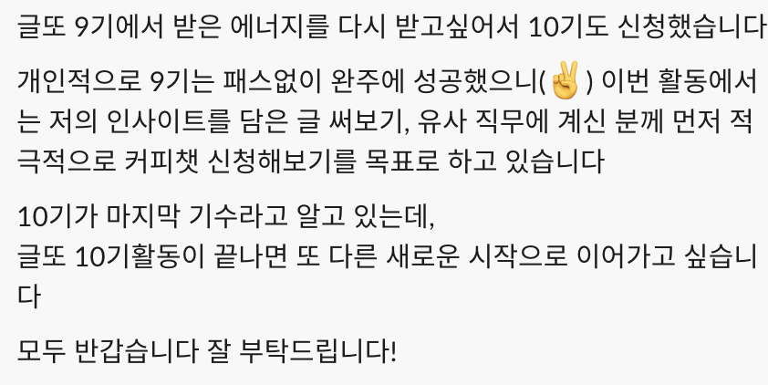 돌이켜보면, 9기와 10기의 나는 꽤 달라져 있었다. 9기 때는 뭔가 계속 시도하긴 했지만 늘 어딘가 채워지지 않는 듯한 아쉬움이 있었다. 반면 10기에서는 대학원 준비와 함께 더 분명한 방향성을 가지고 글을 썼고, 내 생각과 감정을 보다 명확히 마주할 수 있었다. 그래서 누군가 나에게 커피챗을 신청했을 때, 정말 기뻤다. 늘 다른 사람들의 이야기를 궁금해하던 입장에서, 이제는 나도 내 이야기를 나눌 수 있는 사람이 되어 있다는 사실이 반가웠다. 어쩌면 나와 비슷한 생각을 가진 다른 분들도 몇몇 있지 않을까.