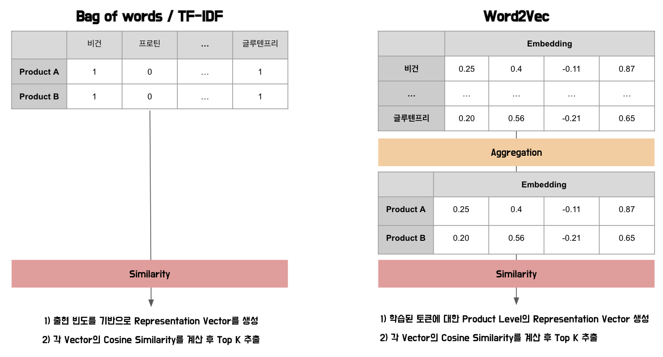 - word2vec 모델의 경우 푸드 도메인에 더 특화될 수 있도록 만개의 레시피 레시피 정보-조리법, 식물성 지향 식품회사 제품-설명, 빵그리의 오븐 등록 상품을 입력데이터로 활용하였습니다. 이때 문맥을 통해 각 토큰간의 유사도를 계산하였습니다.